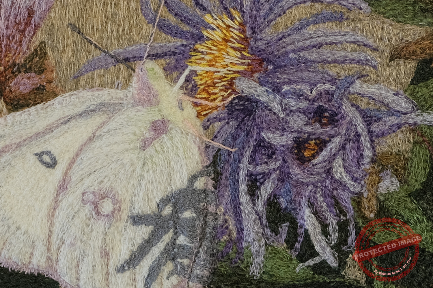 Materials: thread, embroidery floss, fabric, stabilizer Technique: hand-guided longarm machine stitching on collaged fabric, hand embroidery