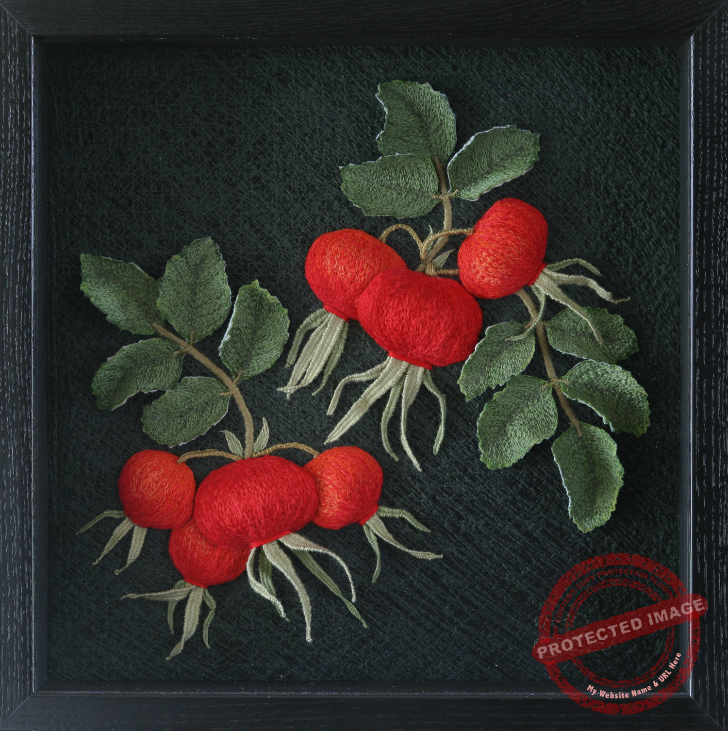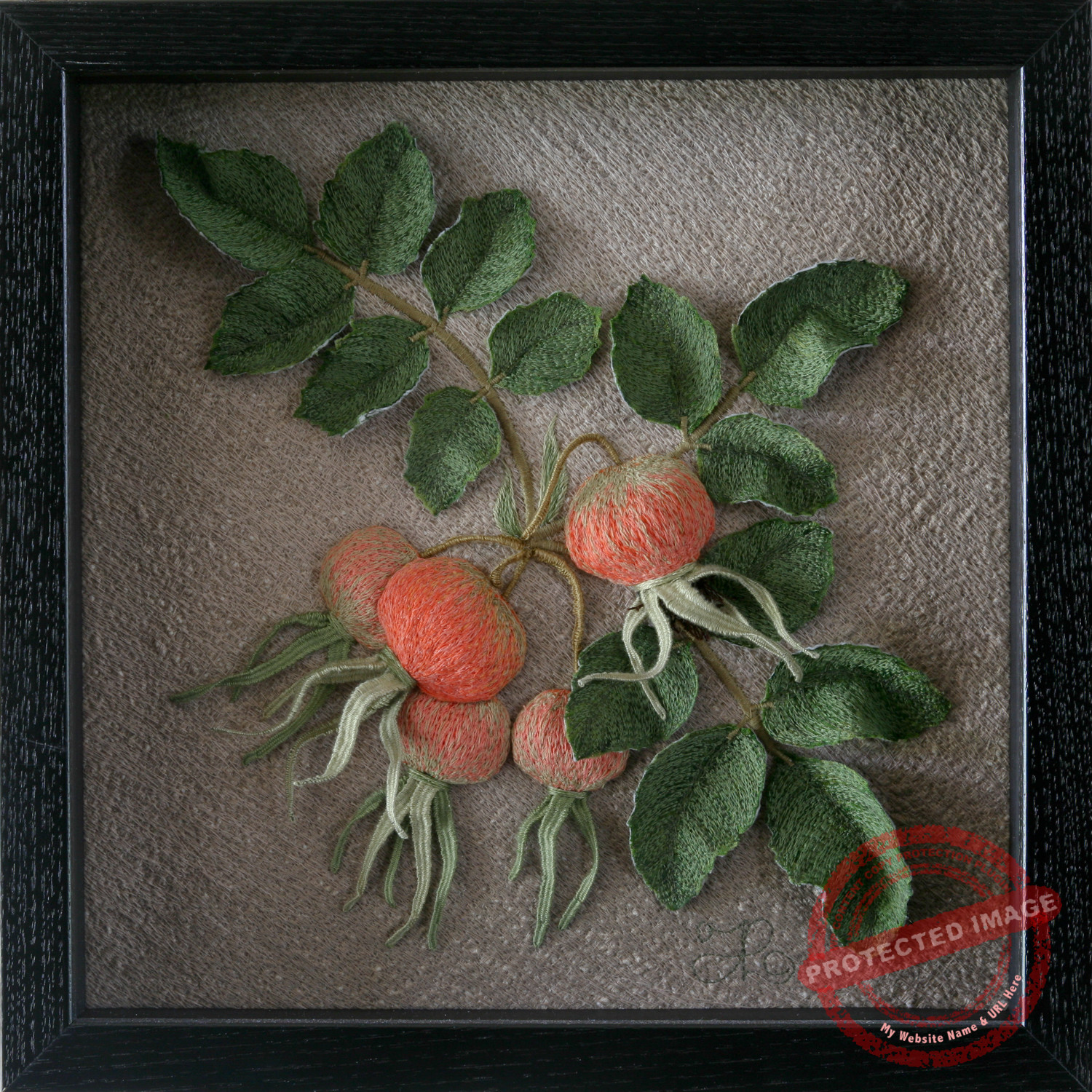 Technique: hand-guided longarm machine stitching, dimensional hand appliqué, hand embroidery