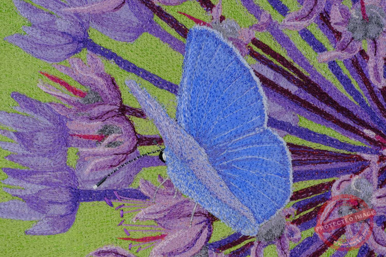Technique: hand-guided longarm machine stitching on collaged fabric, hand embroidery